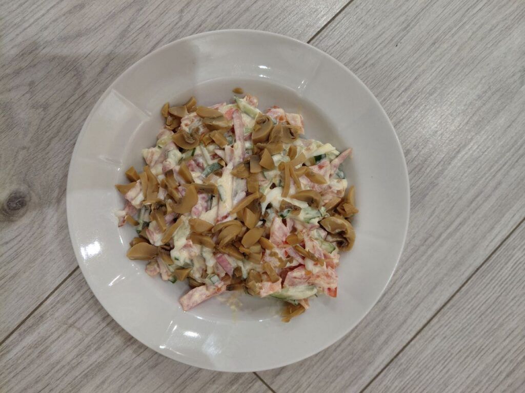 Салат «Вежа» состоит из следующих ингредиентов: шампиньоны консервированные (150 граммов), колбаса сырокопченая высшего сорта (200 граммов), сыр (100 граммов), свежие томаты (100 граммов) и яблоки (100 граммов), майонез (1 пачка). Как готовить? Грибы, колбаску, томаты и яблоки нарезать соломкой, сыр натереть на терке. Все соединить, заправить майонезом, немножко посолить и перемешать.