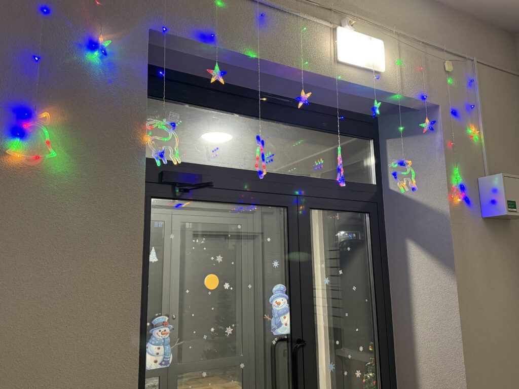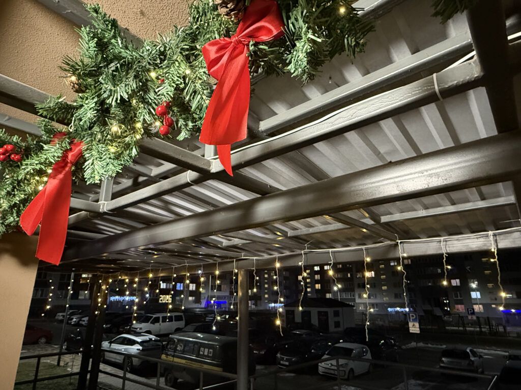 Нарядной инициативой вдохновились и жители соседних домов. На козырьках подъездов развешена мигающая бахрома, окошки «горят» разноцветием.