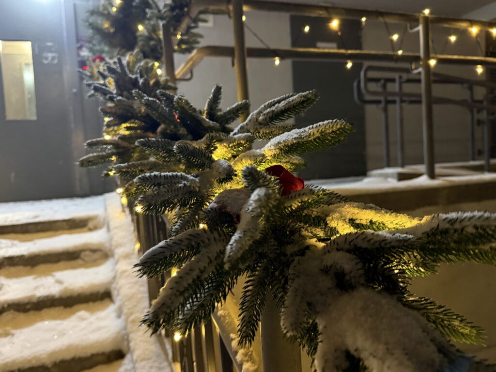 Заглянула сказка и в другой конец улицы — во двор седьмого и девятого домов. Один из подъездов здесь украшен гирляндами из живой хвои.
