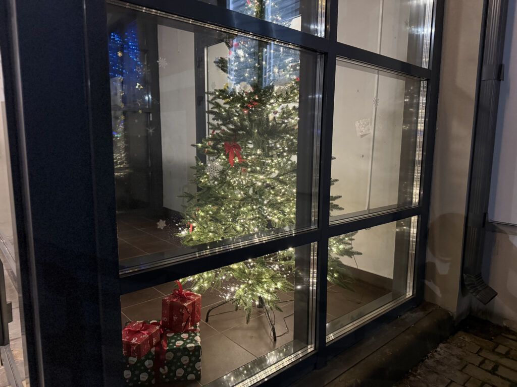 Новогодняя елочка в золотом убранстве радует жителей дома номер шесть. В подъездах тепло мигают огоньки. Праздничная фотозона вдохновляет и хозяев квартир, и прохожих горожан.