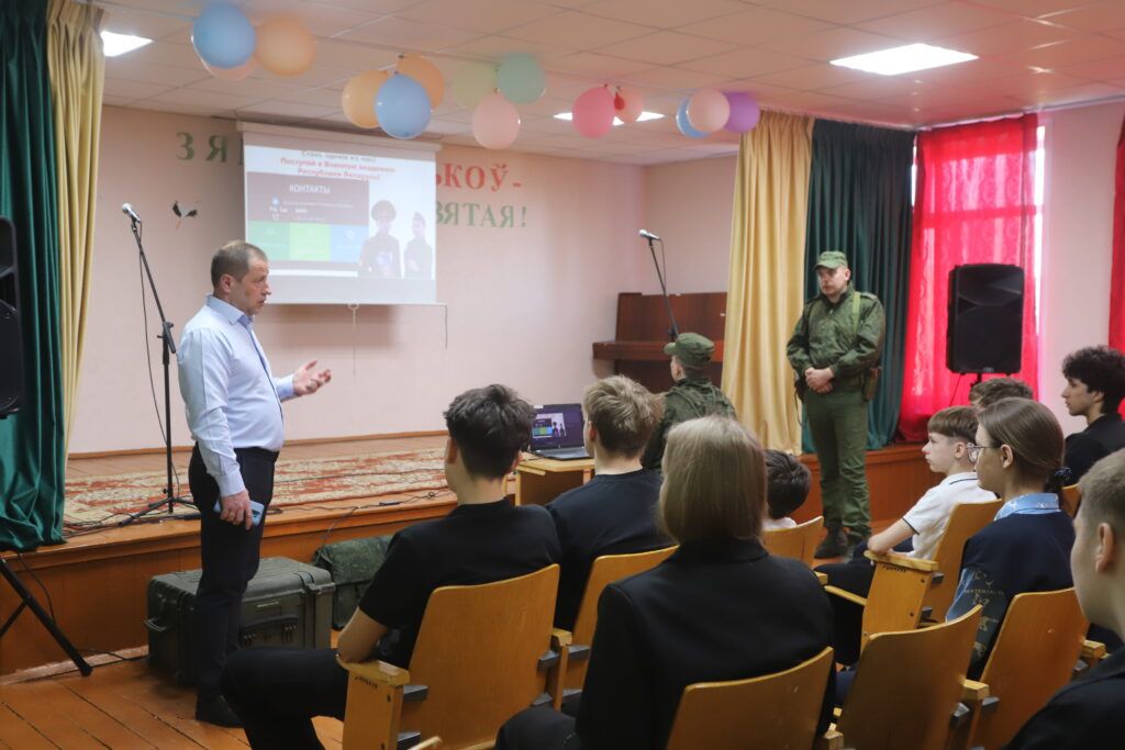 Встреча началась с разговора о будущем. Военнослужащие рассказали старшеклассникам о том, как получить профессию военного, какие требования предъявляются к абитуриентам Военной академии и какие перспективы открывает служба.