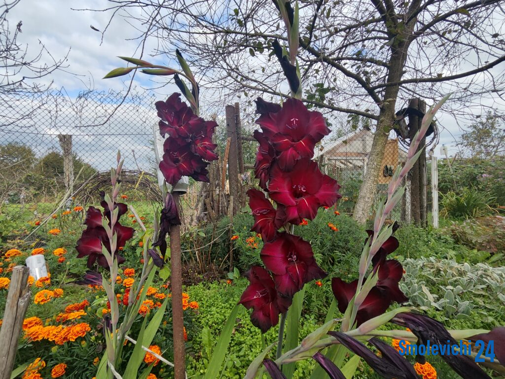 Зинаида Ивановна успевает еще и за цветами ухаживать. Во дворе много ярких красок, но особенно выделяются гладиолусы.