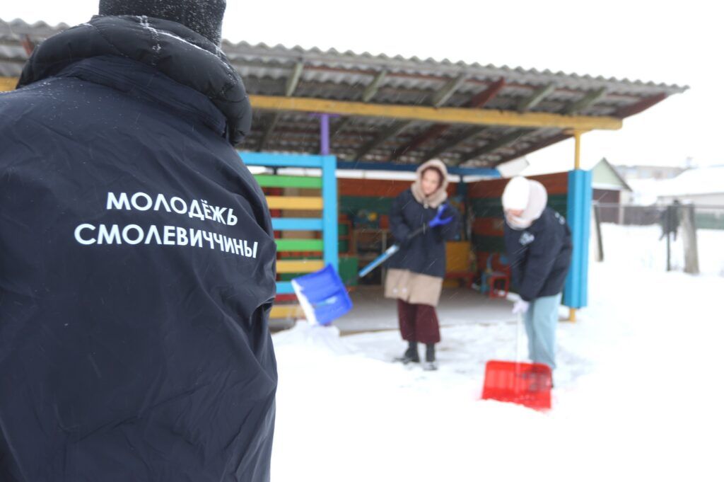 Смолевичская молодежь присоединилась к «Эстафете добра» — волонтеры БРСМ вышли на уборку снега.