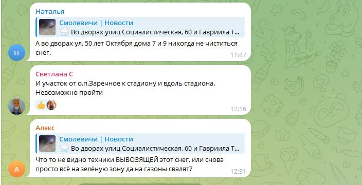 В чат-бота канала «Смолевичи Новости» поступили сообщения от обеспокоенных жителей города. Люди выражают недовольство работой жилищно-коммунального хозяйства, которое, по их словам, не справляется с уборкой придомовых территорий от снега. Проезды и подходы к подъездам остаются заснеженными, создавая трудности для пешеходов и автомобилистов.
