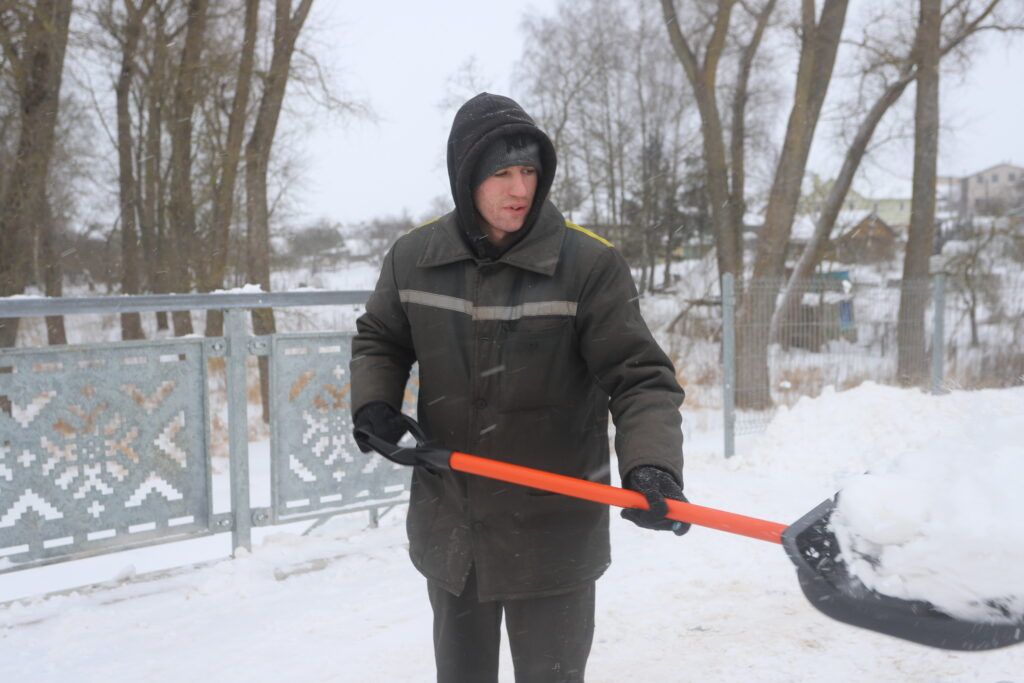 С 5 утра вручную чистят улицы города работники ЖКХ. Для Александра Стрелиса и Сергея Колесника такой разгул стихии — дело привычное, а вот для Алексея Ахремовича, который работает всего второй год, такой интенсивный снегопад — впервые.