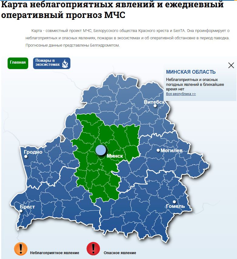 Для того чтобы быть в курсе оперативной обстановки, рекомендуется пользоваться Картой неблагоприятных явлений и ежедневным оперативным прогнозом МЧС. Карта проинформирует вас о неблагоприятных и опасных явлениях, пожарах в экосистемах и об оперативной обстановке в период паводка.