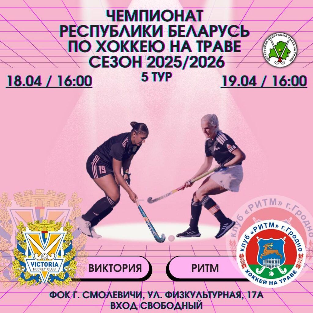 В ближайшие выходные, 18 и 19 апреля, на площадке ФОК (ул. Физкультурная, 17А) состоятся матчи 5-го тура чемпионата Республики Беларусь по хоккею на траве. Смолевичский хоккейный клуб «Виктория» встретится с гродненским «Ритмом».