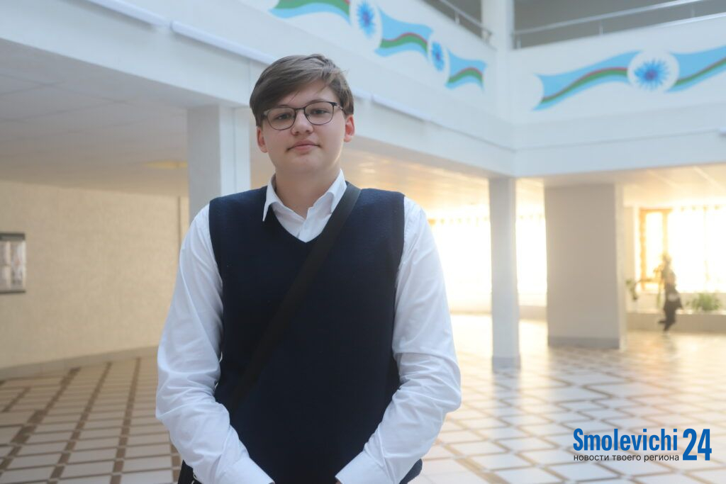 На втором этаже обсуждают свои работы ребята из Усяжской школы. Одиннадцатиклассник Матвей Палянский сегодня писал обществоведение, а на прошлой неделе — белорусский язык.