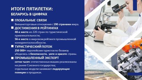 — Экспорт превысил 50 миллиардов долларов, торговля ведется почти с 190 странами мира. Страна вошла в топ-50 туристических направлений, а БелАЭС укрепила энергетическую независимость и открыла новые отрасли.