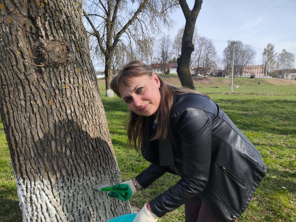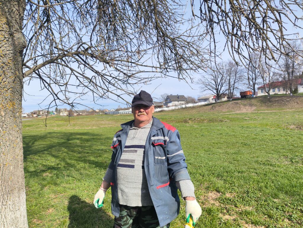 Дворник Заболотского сельисполкома Анатолий Молчан во время субботника занимался побелкой деревьев.