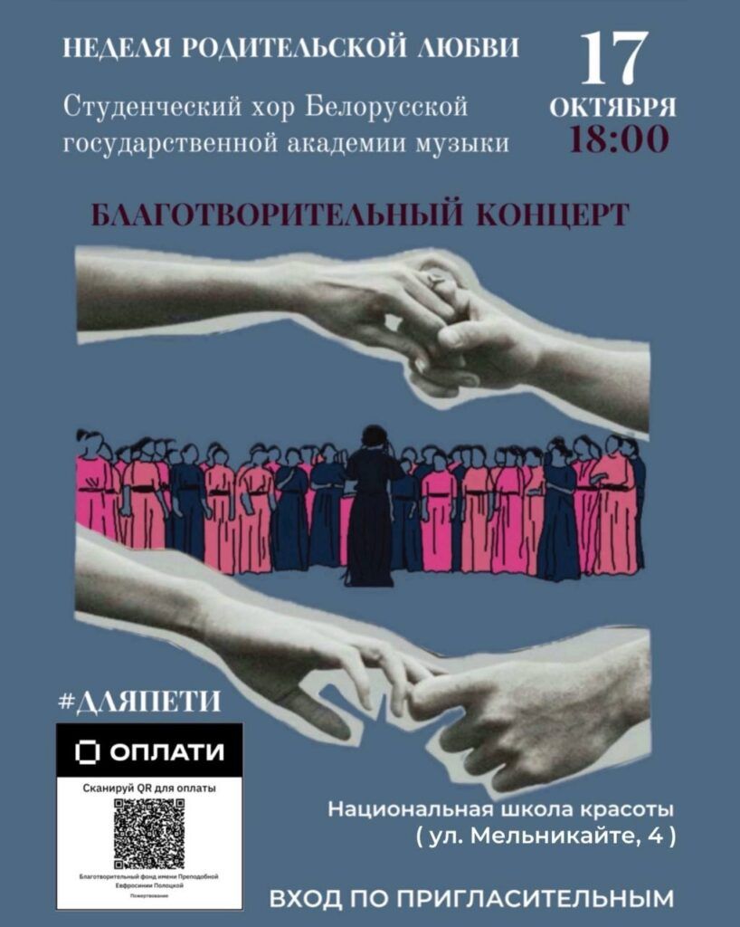 7 октября в рамках Недели родительской любви состоится хоровой благотворительный концерт студенческого хора Белорусской государственной академии музыки (художественный руководитель и дирижер — Инесса Бодяко) «Дарите радость людям» в Национальной школе красоты (ул. Мельникайте, 4).
