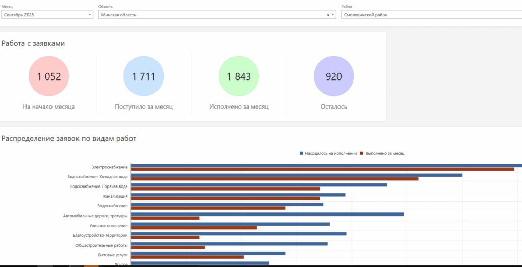 За месяц службы получили 1 843 заявки от жителей. Чаще всего обращения касались электроснабжения, водоснабжения, уличного освещения, состояния дорог и тротуаров, а также благоустройства территорий. И хотя 1073 обращения были решены в срок, 770 – с опозданием. Это означает, что почти половина обращений потребовала больше времени на решение, чем ожидалось.