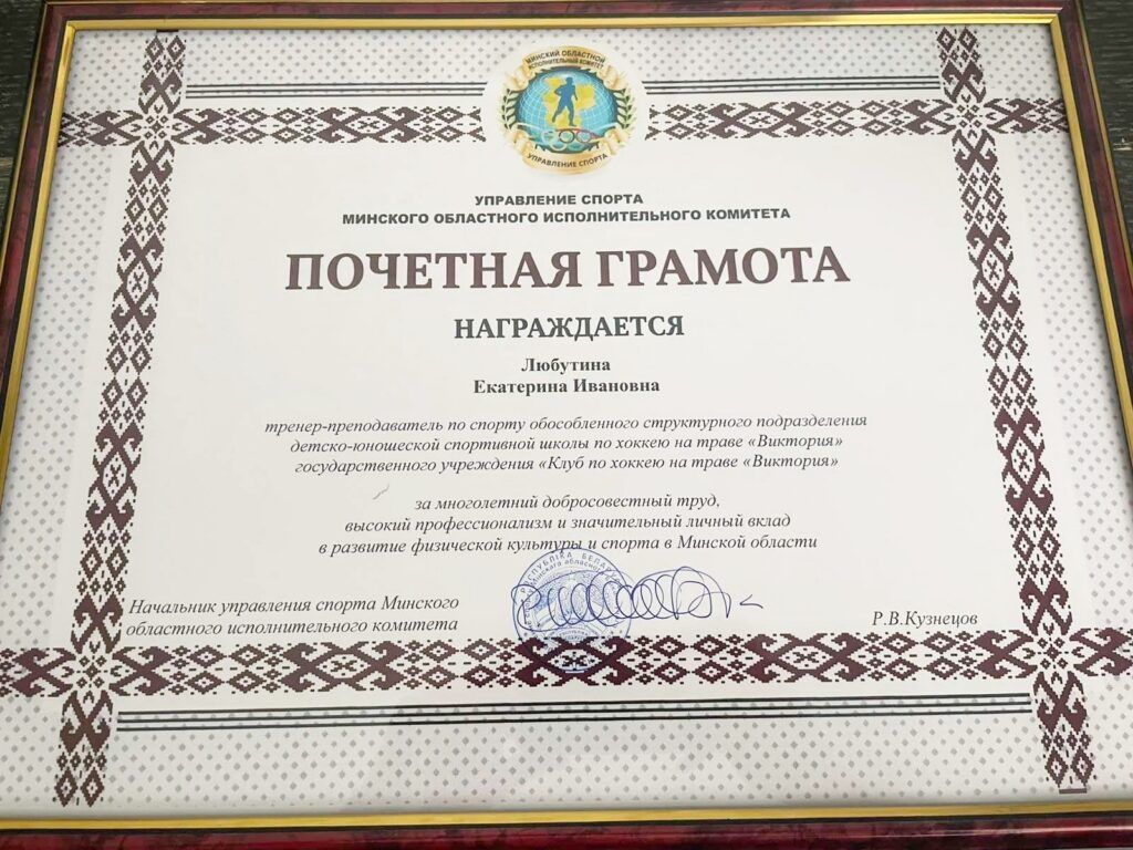 Тренер-преподаватель Екатерина Любутина за многолетний добросовестный труд, высокий профессионализм и значительный личный вклад в развитие физической культуры и спорта в Минской области была награждена Почетной грамотой управления спорта Минского облисполкома.
