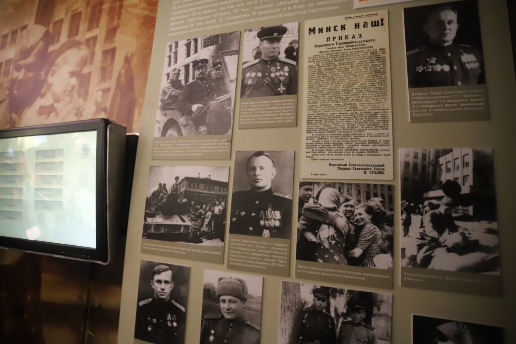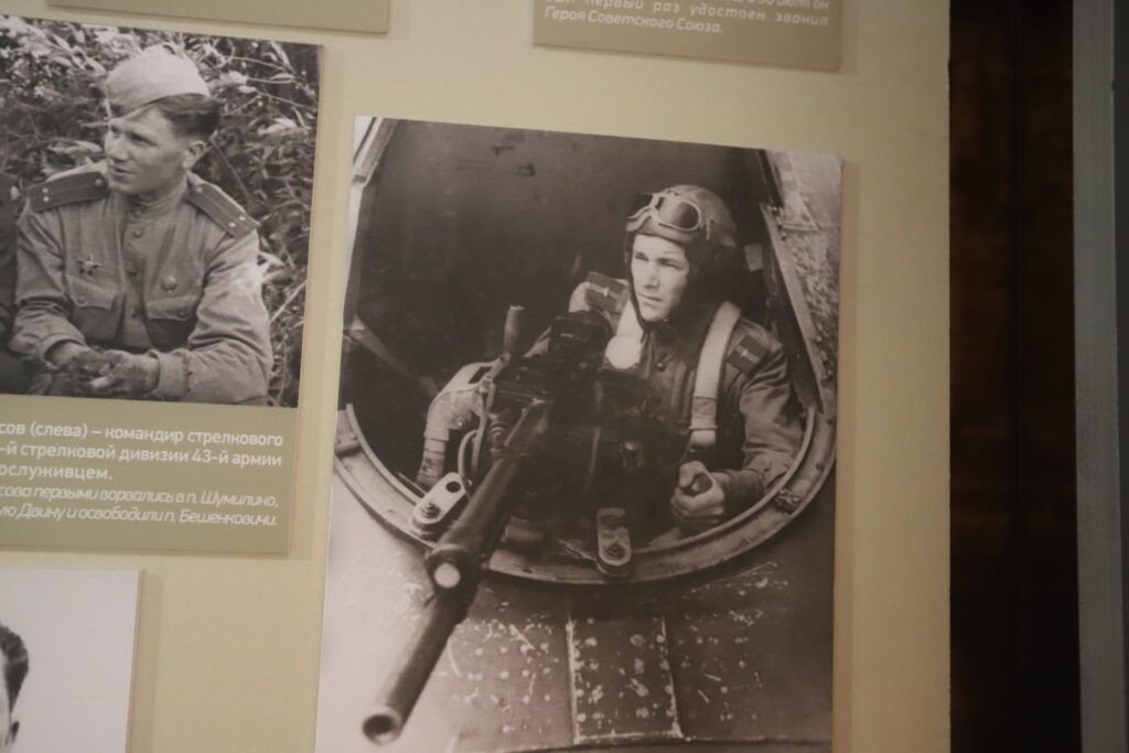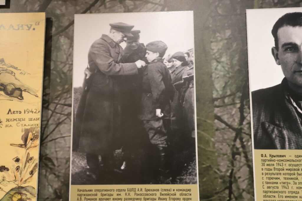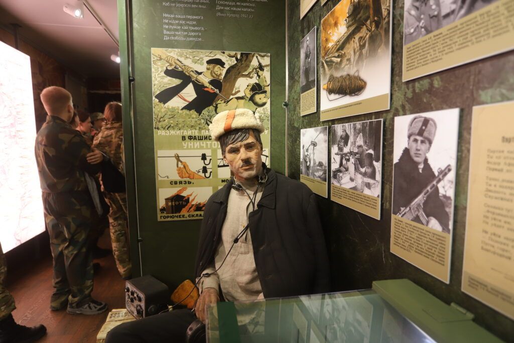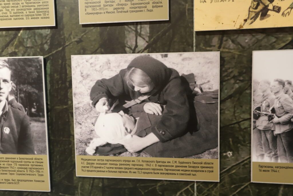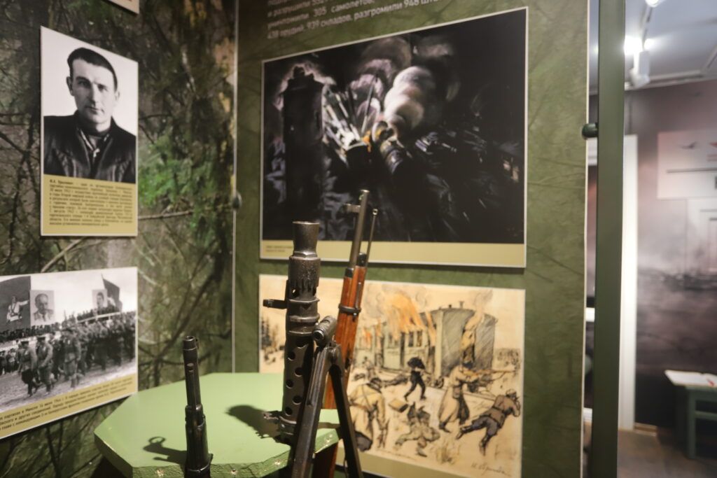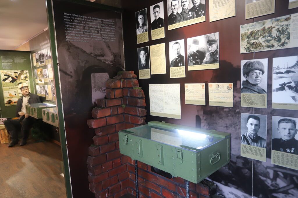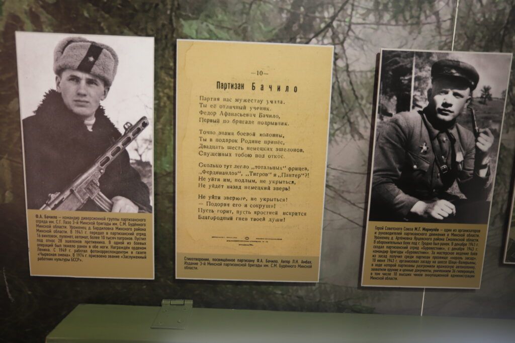 В экспозиции много материалов о военных страницах Смолевиччины: о героях‑земляках Викторе Тумаре, Петре Куприянове, Антоне Алехновиче, о танковом экипаже лейтенанта Фроликова, в числе первых вошедших в Смолевичи во время освобождения Беларуси. Конечно, Анна также рассказывает о партизанах бригады «Разгром».