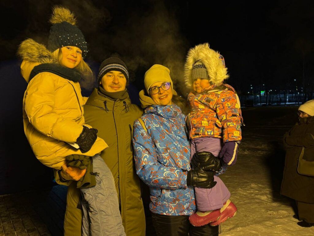 Несмотря на сильный мороз, на озеро приходили целыми семьями, даже с маленькими детьми. Полина, Ксения и Эмилия приехали поддержать папу Виталия.