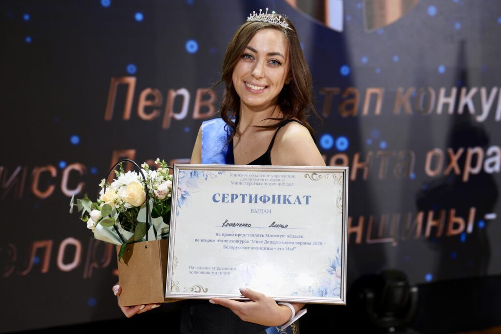 Старший сержант милиции Смолевичского отдела Департамента охраны МВД Дарья Кравченко завоевала корону областного этапа конкурса «Мисс Департамента охраны 2026 – Белорусские женщины – это Мы!», который состоялся в Заславле на минувшей неделе.