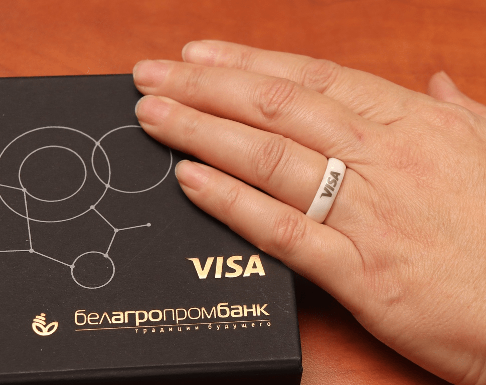 Ольга Капорская рассказала о различных видах оплат. Помимо уже привычных оплат по смартфону и часам, Белагропромбанк предлагает оплатить покупку металлокерамическим кольцом. Также банк выпускает стикеры и брелоки.