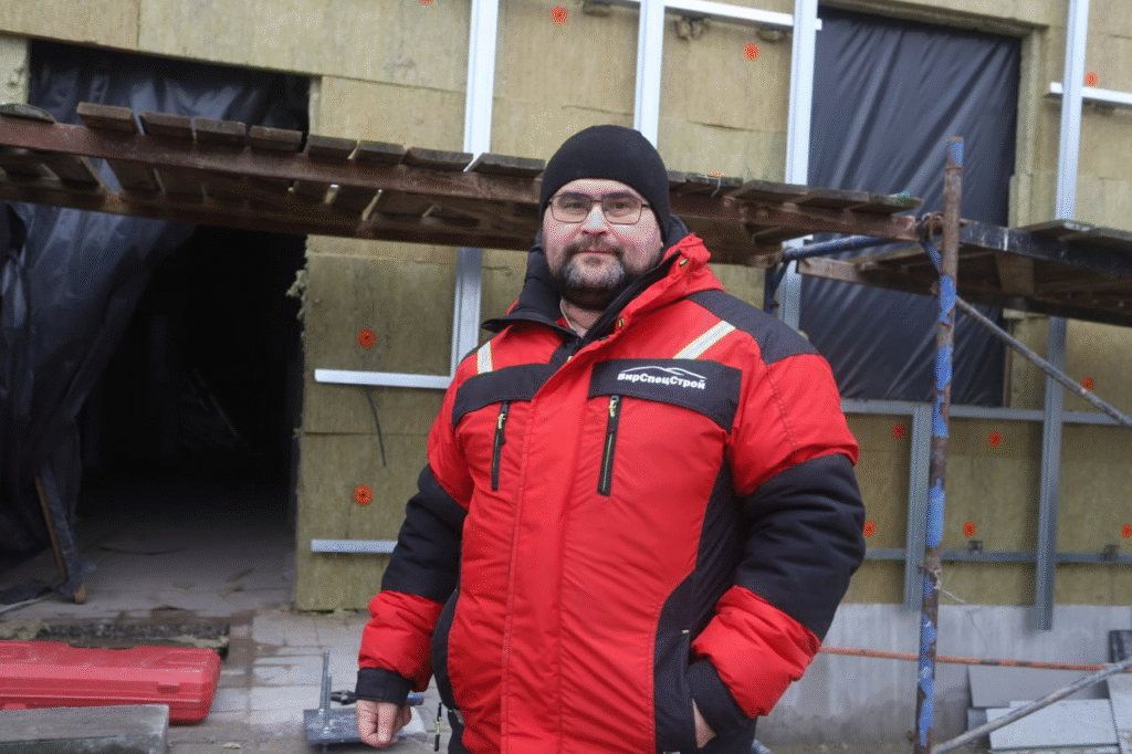 Прораба компании «Вирспецстрой» Алексей Реук встретил у здания, где разместятся кассы и зал ожидания. Строители как раз работали над вентфасадами.