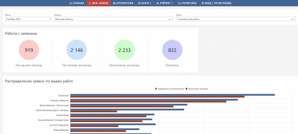 По итогам октября предприятия жилищно‑коммунального хозяйства Смолевичского района выполнили 2 233 заявки от жителей. В срок закрыто 1 258 обращений, еще 975 — с просрочкой.