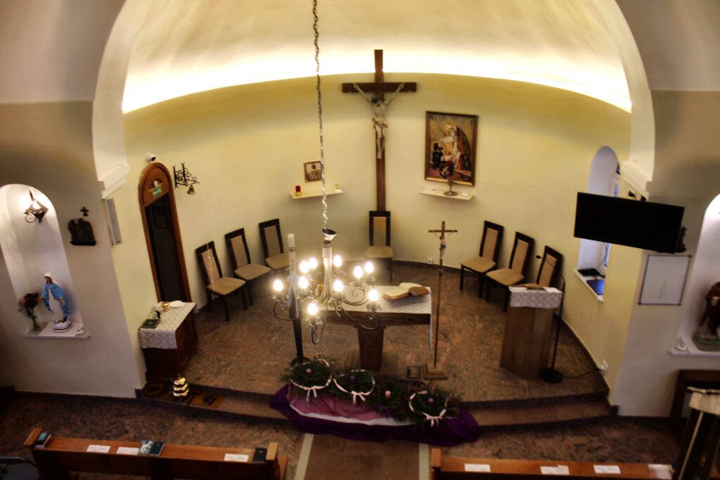 Поздней осенью молиться под открытым небом стало невозможно. Тогда один из прихожан приобрел строительный вагончик, его установили неподалеку от того места, где сейчас возведен костел, сделали ремонт – и богослужения продолжились там.