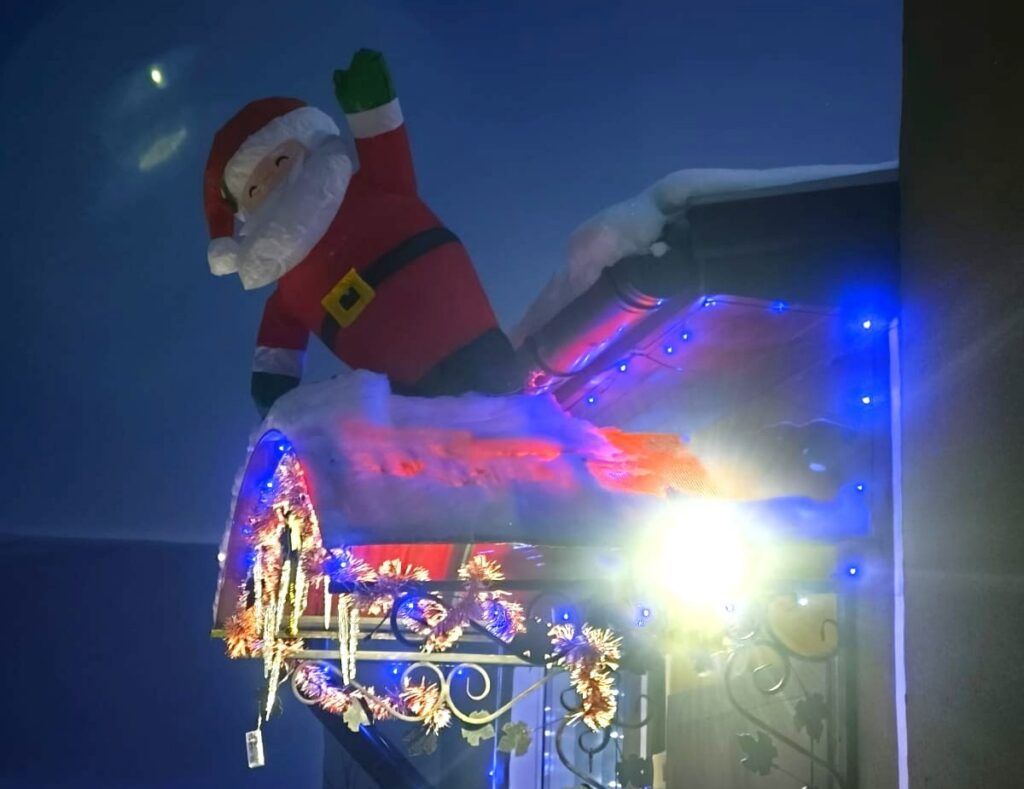 В дополнение к огонькам над крыльцом появился огромный Дед Мороз, а во дворе засверкали нарядные елочки.
