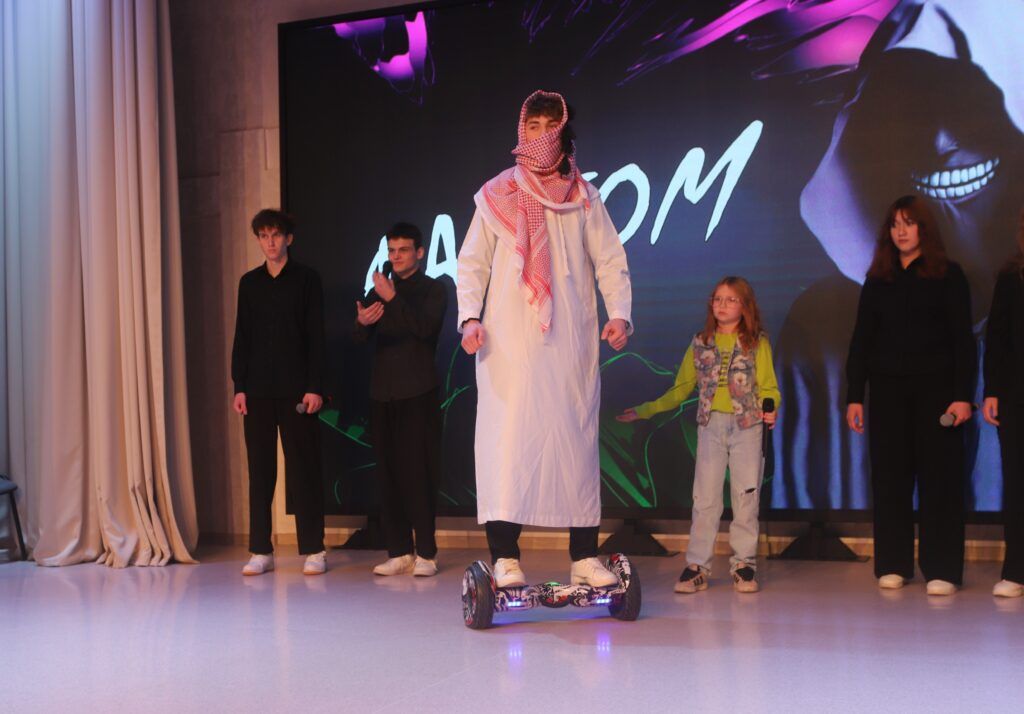 Командир крупской команды совершил эффектный выход на сцену в образе шейха на гироскутере — по легенде он обучал восточных гостей правилам дорожного движения.
