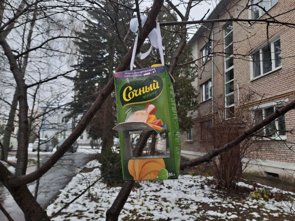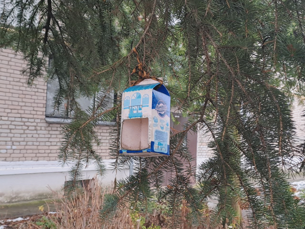 Выпал первый снег, и на деревьях появились кормушки. У дома № 8 по улице Жодинской у каждого подъезда мы нашли по кормушке. Кто-то купил даже специальный девайс.