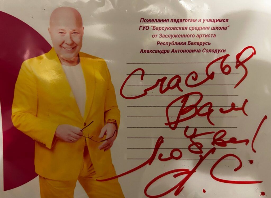 Педагогам посчастливилось увидеться с артистом после выступления. Певец с удовольствием сфотографировался с учителями и передал им открытку с автографом и теплыми пожеланиями для школьного музея.