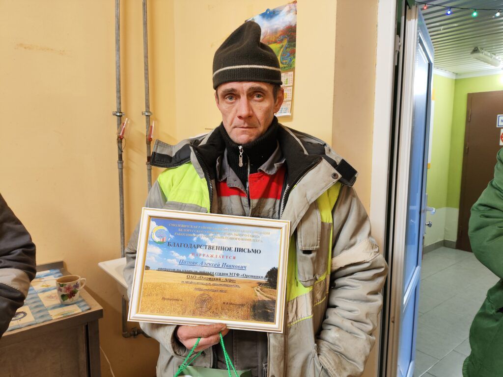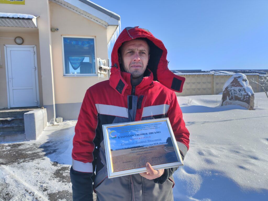 Бригадир Светлана Ковзан и герой дня – оператор по обслуживанию дойного стада Дмитрий Вайницкий – встретили гостей прямо у проходной. Морозец и яркое солнце придавали отличного настроения и бодрости небольшой группе собравшихся: порадоваться за коллег пришли еще несколько работников.