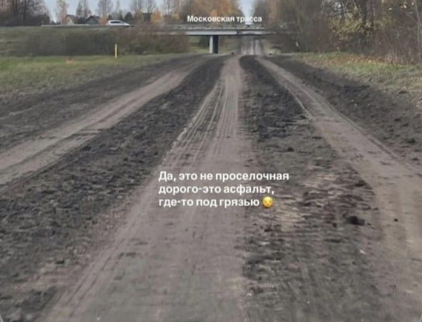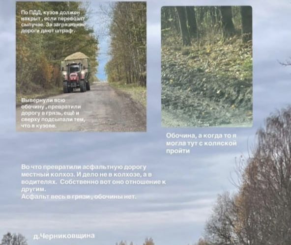 «Во что превратили асфальтную дорогу местный колхоз. И дело не в колхозе, а в водителях. Асфальт весь в грязи, обочины нет. А когда-то я могла здесь с коляской пройти», – пишет она и добавляет: «Это не проселочная дорога, а асфальт под грязью».