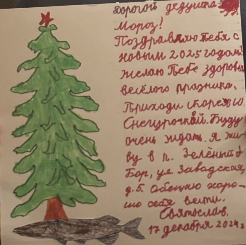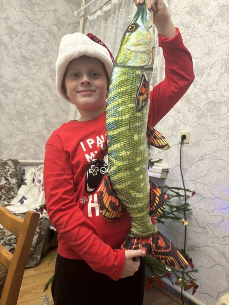 А еще Дед Мороз рассказал, что Святослав – маленький рыбак. У него дома живет целая армия плюшевых рыбок, но и настоящих он поймал немало: на рыбалке ему помогает дедушка.