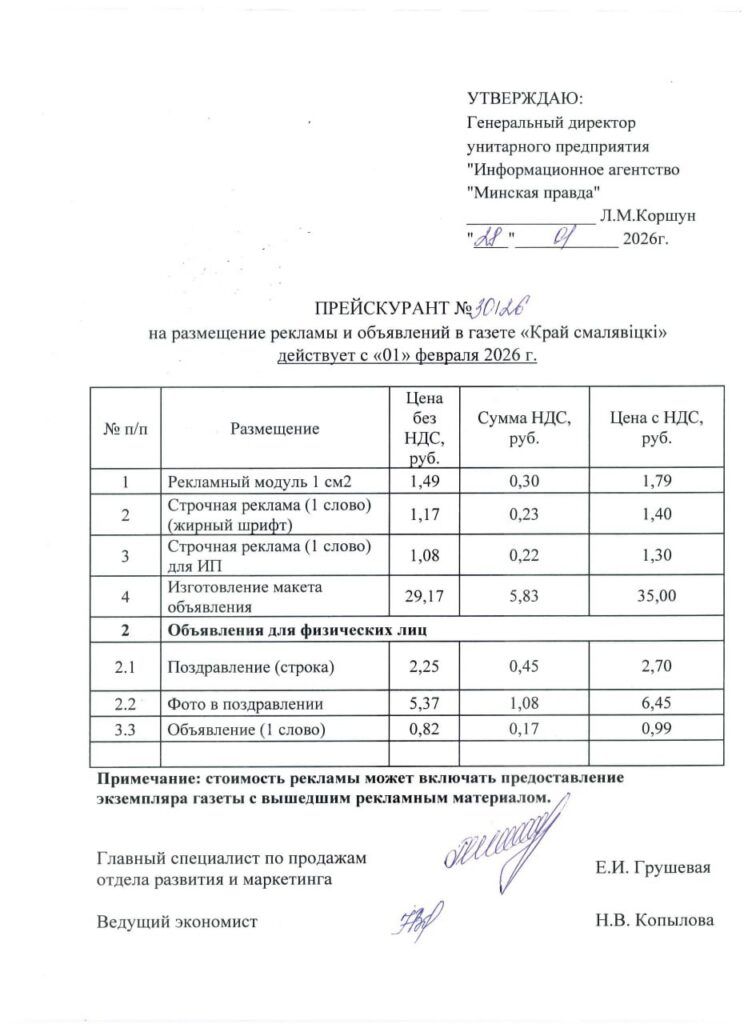 ПРЕЙСКУРАНТ отпускных цен на размещение рекламных материалов и/или объявлений на интернет-сайте smolevichi-24.by, социальных сетях редакции газеты «Край смалявiцкi» (действует с 01.07.2025 г.)